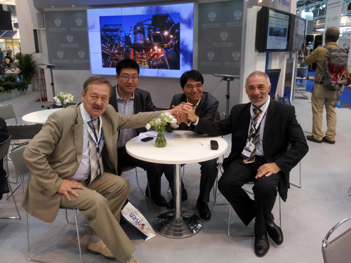 合能陽光與俄略斯TELECOM公司達(dá)成戰(zhàn)略合作伙伴關(guān)系。上圖為合能陽光總經(jīng)理肖宗杰,國際部經(jīng)理董培明與TELECOM總裁Mr.Vladimir,副總兼技術(shù)總監(jiān)Mr.Boris合照。