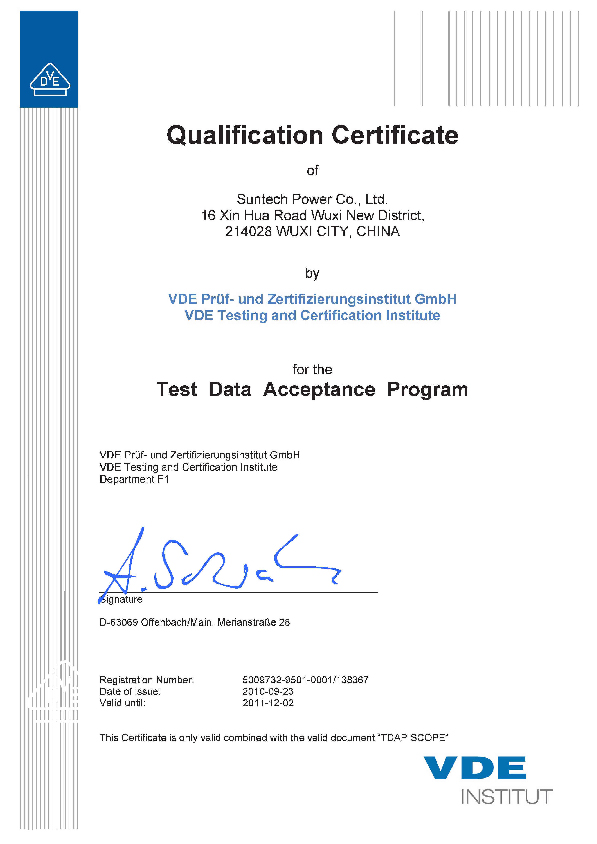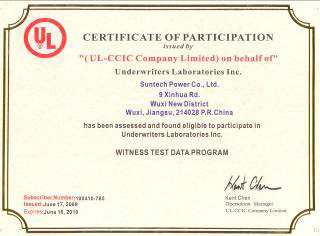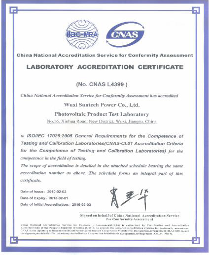 同時尚德光伏組件檢測實驗室是中國第一個頂尖水準檢測實驗室,并獲得Underwriters Laboratories (UL) 機構授予該實驗室見證測試程序 (WTDP) 證書。
