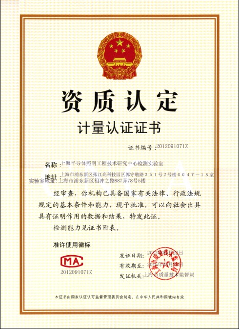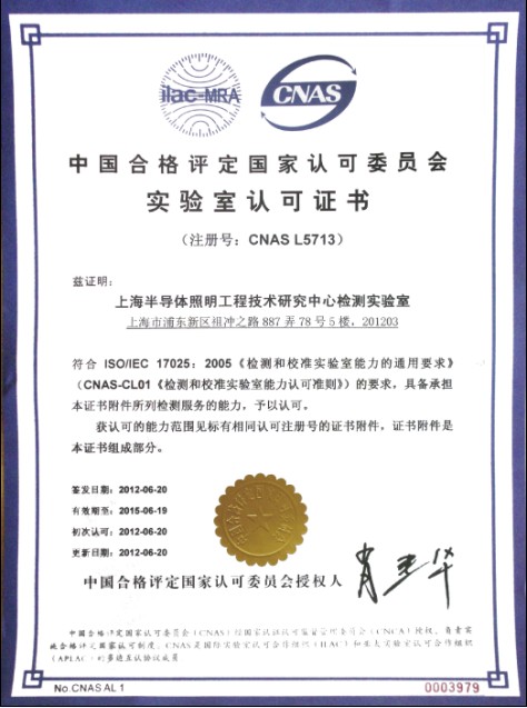 上海半導(dǎo)體照明工程技術(shù)研究中心檢測實(shí)驗(yàn)室於2012年5月22日獲得中國計(jì)量認(rèn)證CMA資質(zhì);於2012年6月20日正式獲中國合格評定國家認(rèn)可委員會(huì)(CNAS)檢測實(shí)驗(yàn)室能力認(rèn)證(注冊編號(hào):L5713)。