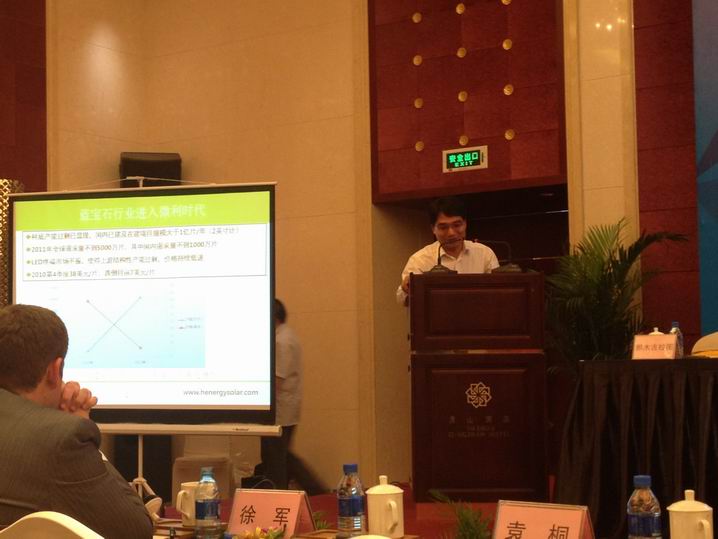 The picture shows HenergySolar Technology Co., Ltd., CEO  Zongjie Xiao made ??a keynote speech of  sapphire quality control  in the  low-profit era ".