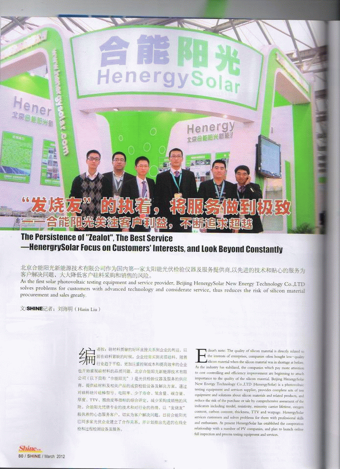編者按:硅材料質(zhì)量的好壞直接關(guān)系到企業(yè)的利益,以前在硅料緊缺的時(shí)候,企業(yè)經(jīng)常買到劣質(zhì)硅料。隨著行業(yè)趨于平穩(wěn),更加注重控制成本和提高效率的企業(yè)也開(kāi)始重視硅材料的品質(zhì)問(wèn)題。北京合能陽(yáng)光新能源技術(shù)有限公司(以下簡(jiǎn)稱“合能陽(yáng)光”)是光伏檢驗(yàn)儀器及服務(wù)的供應(yīng)商,提供硅材料及相關(guān)產(chǎn)品的成套檢驗(yàn)設(shè)備及解決方案,通過(guò)對(duì)硅料硅片硅棒型號(hào)、電阻率、少子壽命、氧含量、碳含量、厚度、TTV、翹曲度等指標(biāo)的綜合評(píng)定,減少采購(gòu)或銷售的風(fēng)險(xiǎn)。合能陽(yáng)光憑借專業(yè)的技術(shù)和對(duì)行業(yè)的熱情,以“發(fā)燒友”般執(zhí)著的心態(tài)服務(wù)客戶,切實(shí)為客戶解決問(wèn)題。目前合能陽(yáng)光已同多家光伏企業(yè)建立了合作關(guān)系,并計(jì)劃推出先進(jìn)的在線全檢和過(guò)程檢測(cè)設(shè)備及服務(wù)。