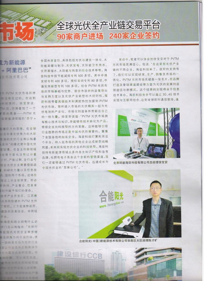 合能陽光陳經(jīng)理:近兩年來隨著江西及華南一帶區(qū)域的光伏行業(yè)的逐步發(fā)展,特別是江西省聚集了LDK、晶科及旭陽雷迪等一批優(yōu)秀的光伏企業(yè),成為這一區(qū)域的核心地區(qū),合能陽光(中國)新能源技術(shù)有限公司作為一個 國內(nèi)最大的太陽能光伏行業(yè)最大的品質(zhì)控制解決方案提供商,有責(zé)任和義務(wù)為我們的客戶提供優(yōu)質(zhì)的服務(wù),借著新余成立光伏交易市場的契機(jī),同時也靠近大客戶LDK的地理優(yōu)勢,我們當(dāng)然有理由把它作為我們這一區(qū)域的根據(jù)地,以它為中心,輻射江西、湖南、福建、廣東等華南區(qū)域,更好的為這一區(qū)域的客戶服務(wù),我本人也是從2004年開始進(jìn)入了光伏行業(yè),了解了行業(yè)九七年到零二年的低落期,也經(jīng)歷零八零九年的低谷期,從每個行業(yè)的發(fā)展規(guī)律來看目前這個行業(yè)本身還是屬于起步階段,起步階段時期其實(shí)也是個經(jīng)驗(yàn)摸索時期,不能因一時的高潮而瘋狂,也不能因一時的低落而消極,高潮期需要冷靜,低落期更需要一種堅韌不拔的精神,是挑戰(zhàn)同時更是機(jī)遇,合能陽光(中國)秉著致力于成為太陽能檢測方案的最大提供商和服務(wù)商,致力于不斷提升客戶產(chǎn)品品質(zhì)和競爭力,入駐了PVTM中國(新余)光伏交易市場,并努力把PVTM作為我們的江西乃至華南區(qū)域的核心辦事處。